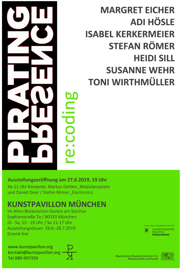 Pirating Presence ist ein konzeptuelles Ausstellungsprojekt, das sich unter Mitwirkung von 7 Künstlerinnen und Künstler im Zeitraum von 19 Monaten in 6 Kunstvereinen und Museen mit variierenden Perspektiven dem Thema der Bildaneignung widmet. Der Kunstpavillon München ist mit dem Untertitel „re:coding“die finale Station des Projekts.