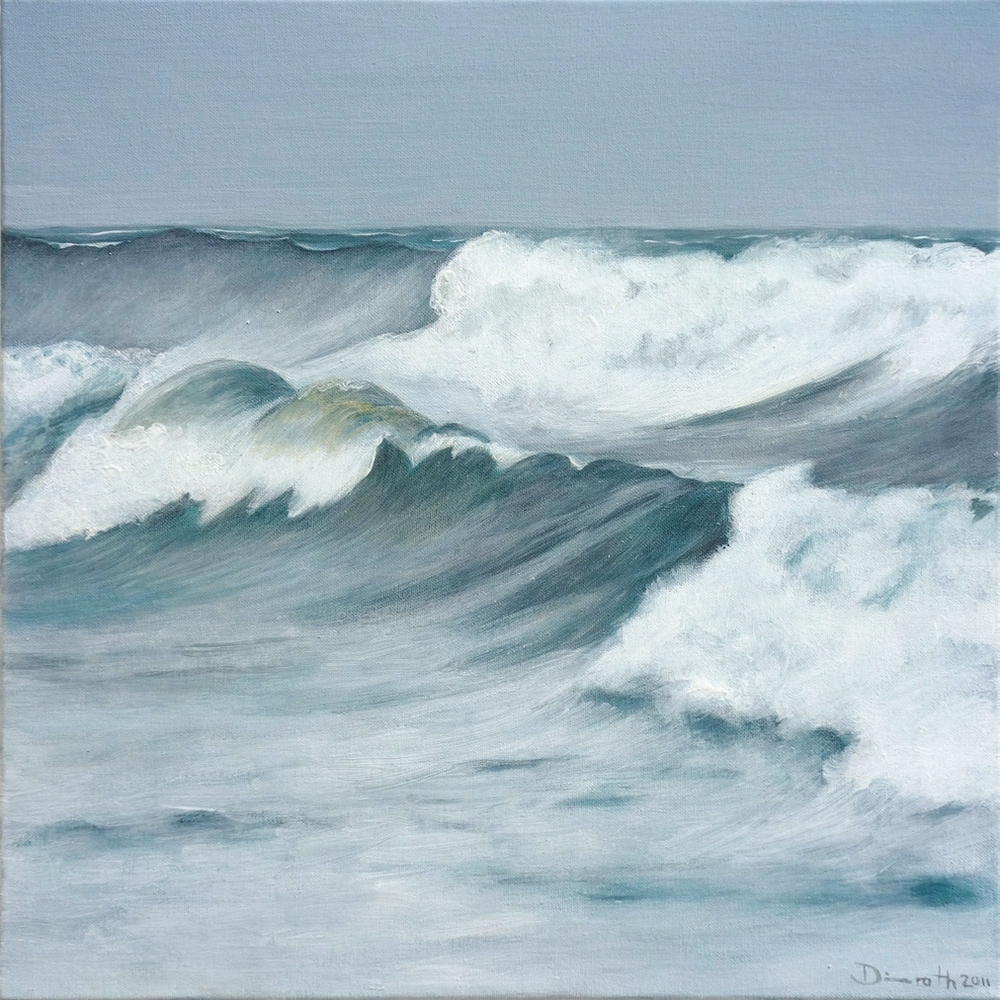 Sinda Dimroth zeigt Landschaftsbilder, Kopfbilder und Skulpturen aus Acrylglas. Bei den duomedialen Bildern ist das Mittelstück eine Fotografie, die mit dem Computer bearbeitet wurden. Rechts und links daneben, gemalte Landschaften, die wie die Fortsetzung der Fotografie wirken. Bei dem Mit- und Gegeneinander der beiden Medien, durchschaut das Auge im Wortsinn die Oberfläche und sieht in eine räumliche und zeitliche Entfernung. Wechselt der Blick auf die gemalten Landschaften der Seitenteile, wird einem die materielle Präsenz der Malerei bewusst: Nähe und Gegenwart entstehen. (Reinhard Fritz)
